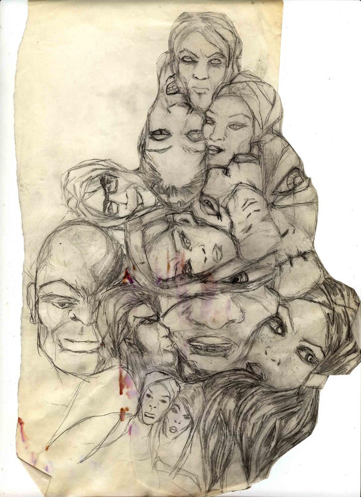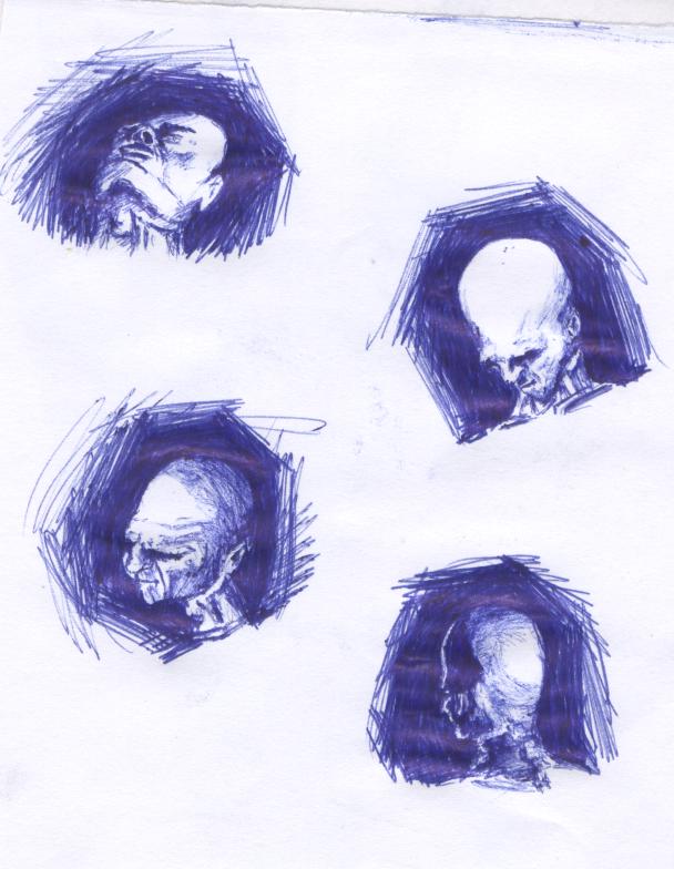 Saludos. Aquí os pongo algunos de los dibujos que hacía cuando me aburría en las clases (o sea en casi todas) y me entraban estas paranoias. El otro día abrí la libreta (llena polvo) y los encontré.