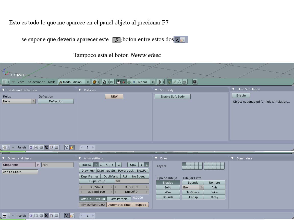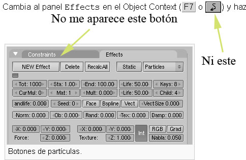 Mi problema es que en Blender no me aparece la pestaña effects en panel objetos (f7) y no puedo lograr una emición de partículas.