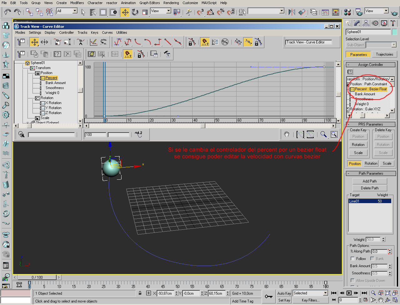 Saludos vulkem: Esto de las velocidades de los recorridos es un poco puñetero. No viene nada en la ayuda, pero existe un truco para poder controlar la velocidad del Path constraint sin tener que meter keys a destajo. Lo que hay que hacer es lo siguiente: por defecto, el Path constraint asigna al Percent un controlador linear (no editable) y simplemente hay que cambiar el controlador por un Bézier. Abajo pongo unas capturas de pantalla para que se entienda el proceso.
