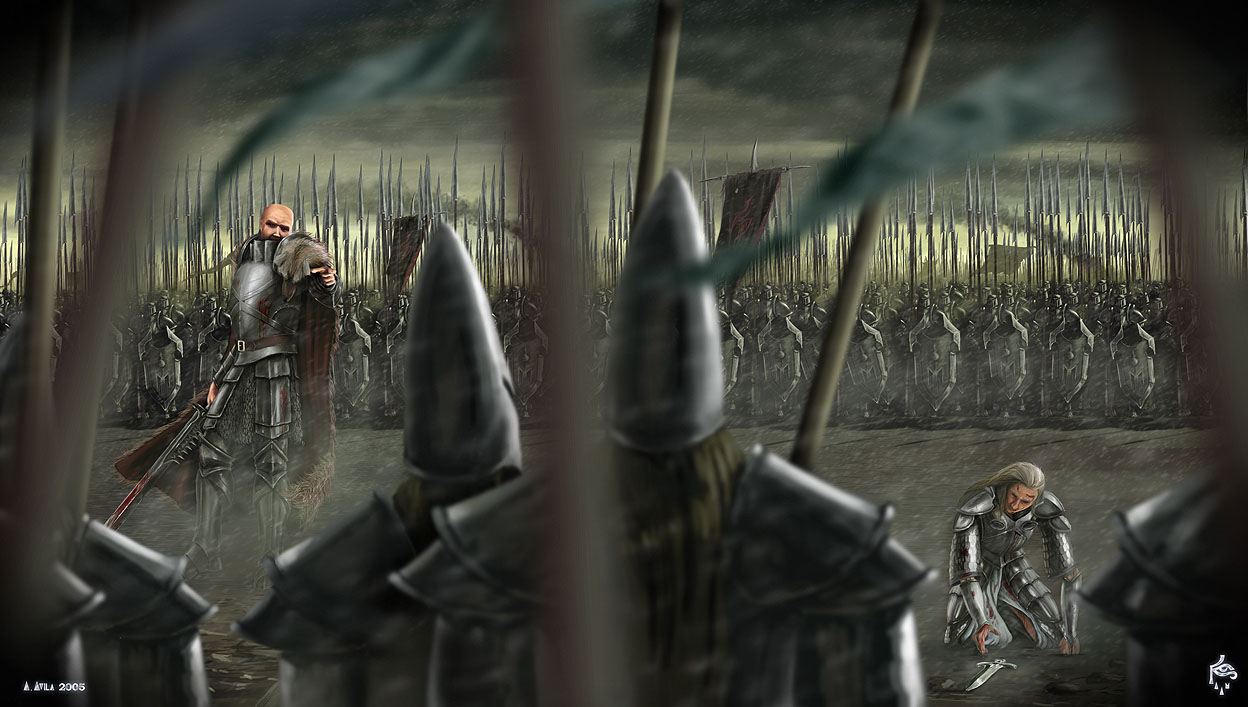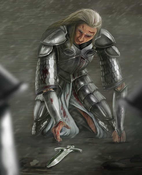 En cuanto al diseño artístico, los que tienen armadura están instpirados en el caos, de Warhammer, y los otros en altos elfos. La escena tenía que ser una especie de duelo, en el cual el elfito gay no puede seguir, y el otro le insta a que se levante. Saludos.