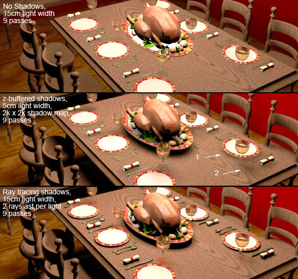 Shadow map (sombras de mapa): cuando se quiere simular un día nublado, pero se desea que aparezcan sombras paralelas. La sombra resultante presenta unos contornos suaves y difuminados.