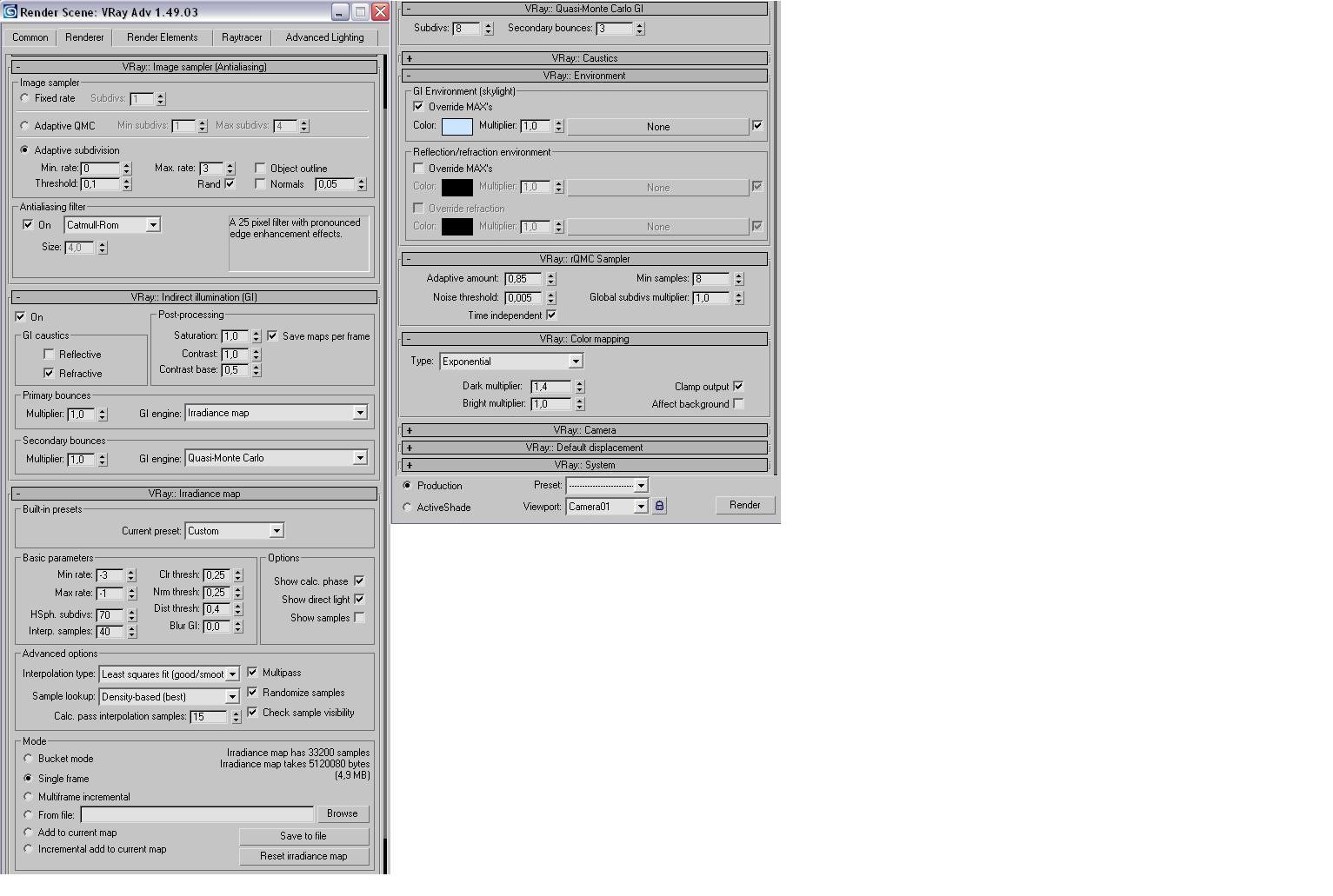 Hola de nuevo, primeramente gracias a todos por contestar, h estado jugando con la solución que me habéis dado, pero no he conseguido arreglarlo, sin embargo, he jugado con los parámetros del Irradiance Map, lo único que he cambiado ha sido el max rate que lo he puesto en 1 las hsph, subdivisiones las he subido a 70 y los interp, samples a 40 y ha mejorado bastante. Yo pensaba que con la configuración anterior (min rate-3, max rate -1)me daría un resultado parecido al que acabo de obtener, ahí va mi pregunta ¿por qué tengo que meterle tanta cañaal Irradiance Map para que me de este resultado? Gracias y saludos.