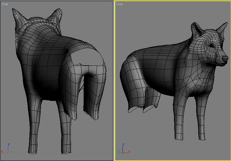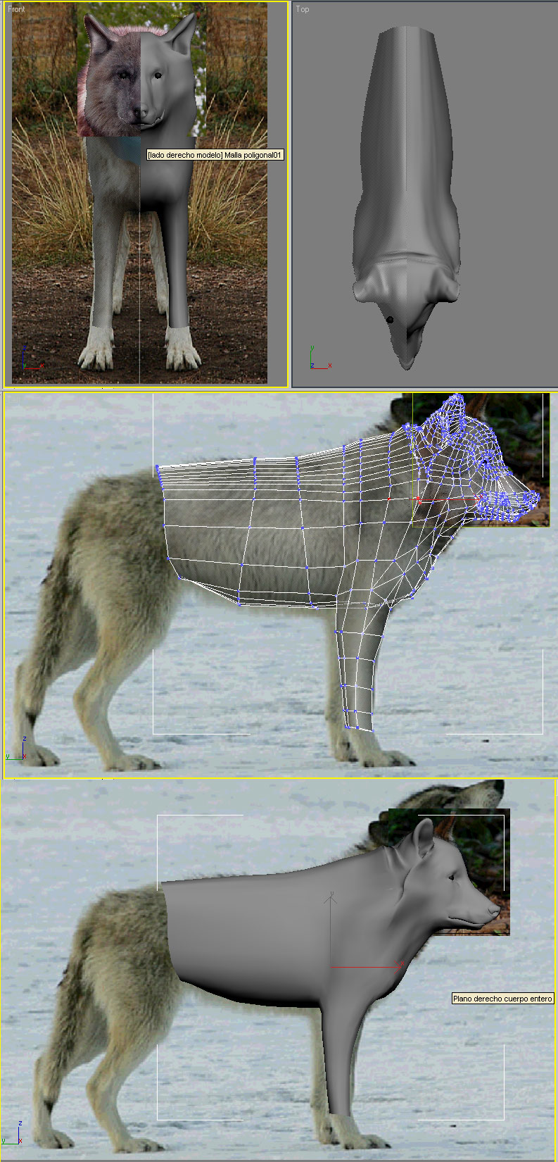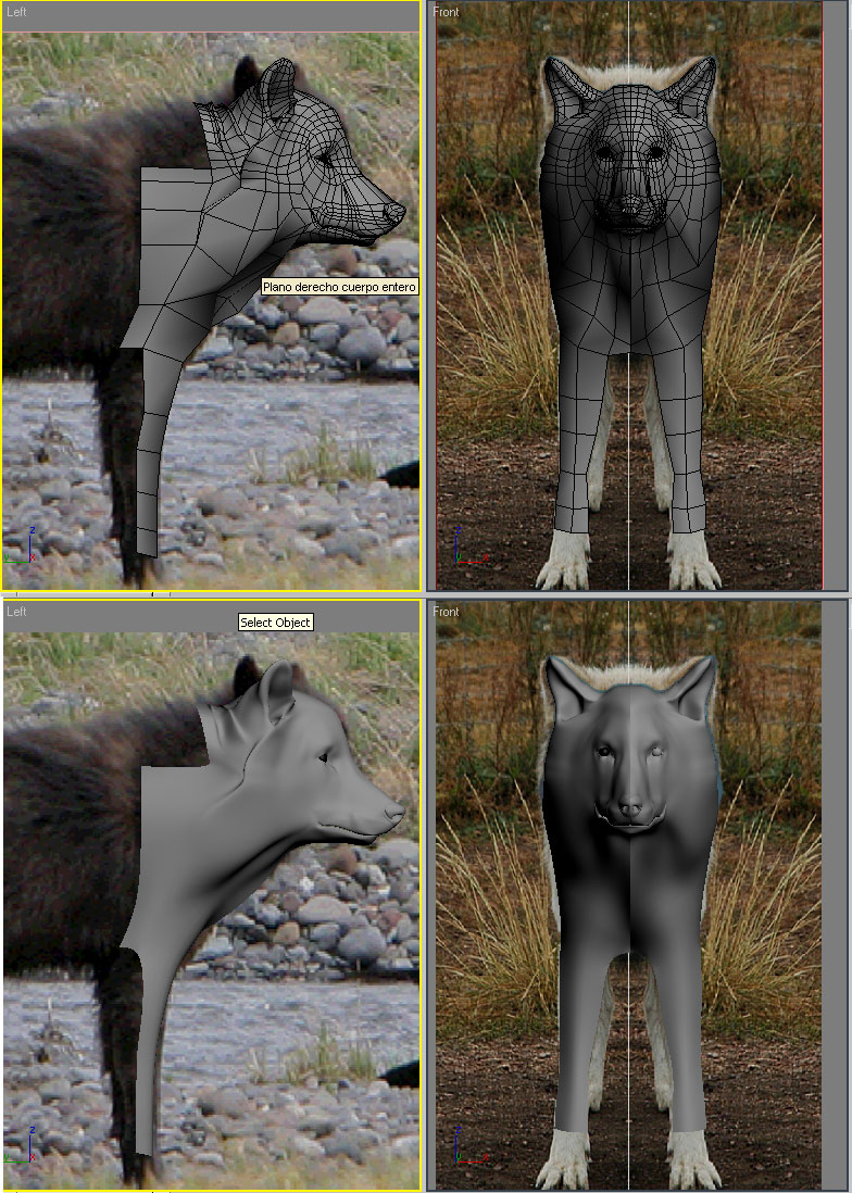 Agradezco cualquier comentario y sugerencia, el modelo pretende ser un lobo sin pretender ser un modelo hiperrealista, por exigencias del proyecto no se puede usar Fur o Hair de max así que, todo el pelo debe ser geometría y así es como lo estoy haciendo, gracias a todos.