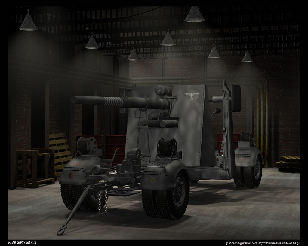 Muy bueno ese modelado. Parece como si estuviese esperando la ocasión para liarme a tiros con el vecino. En mi opinión, es curioso, pero me parece que está mejor iluminado el resto de la escena que el propio Flak, para empezar te aconsejaría que le dieses un poco más de especularidad a la pintura (utiliza un procedural) ya que echo de menos un poco más de brillo, ya sé que la pintura es mate, pero un poco de especularidad no le vendría mal (en mi modesta opinión), luego y ya para rizar el rizo, haría que le entrase la luz del sol, como si lo fuesen a sacar para darle un paseo los domingos al campo de tiro. Eso reforzaría la iluminación que de por si es escasa y le daría movimiento y expectación a bicho, si lo enciendes y sale humo, ni te cuento. World war a la vista.