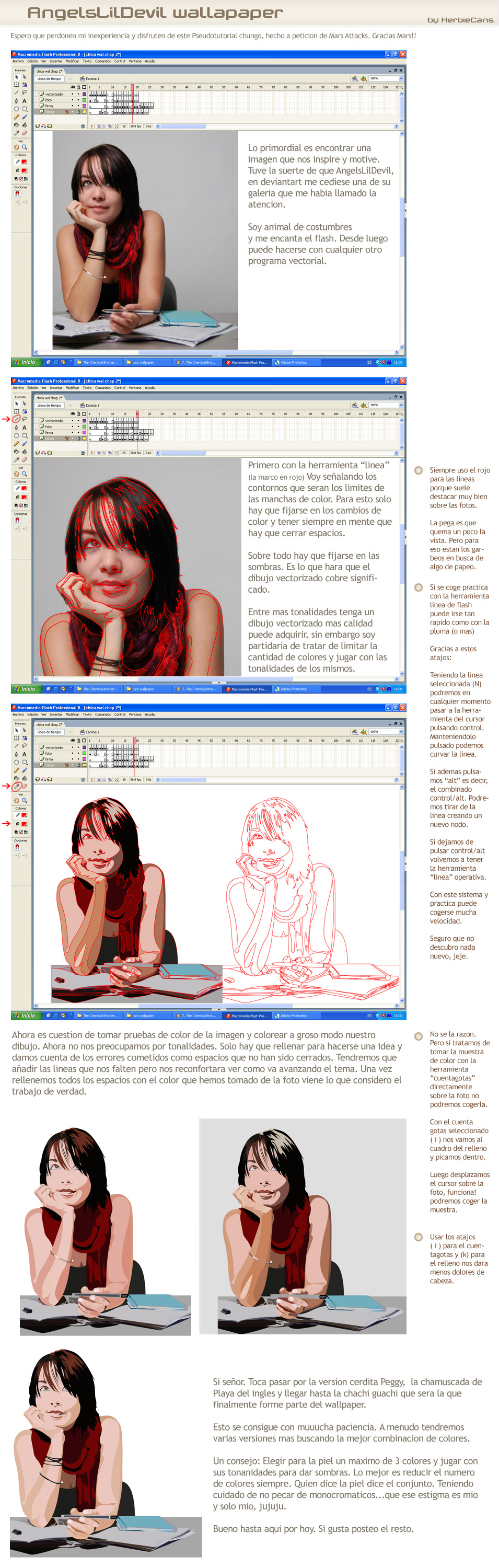 Intentaremos seguir feos para que tú siguas haciendo wallpapers de mujeres. El tutorial está muy bien una duda, en flash no hay herramienta de cortar como en FreeHand y en Inkscape tampoco existe y como veo tú no superpones capas, sino que las haces que coincidan los bordes, como haces para que los bordes sean coincidentes? Es que yo uso otra forma que me parece más cómoda, pero solo x saber tu técnica en ese aspecto.