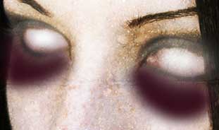 *creamos una capa en blanco, sobre la capa de la textura y con un pincel normal con los bordes difuminados y con diámetro de 35 px y con el siguiente color #38111e (r56, g17, b30) y pintamos dos ojeras o sombras bajo los ojos y le damos un filtro de desenfoque de Gaussiano de entre 10 y 15 px según nuestra trazo.