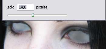 *ahora con la aparente locura del relleno de los ojos negros, nos vamos al menú filtro>desenfocar>desenfoque de Gaussiano, con radio de 14 px presionamos invertir. Ahora invertimos la imagen Control + i.