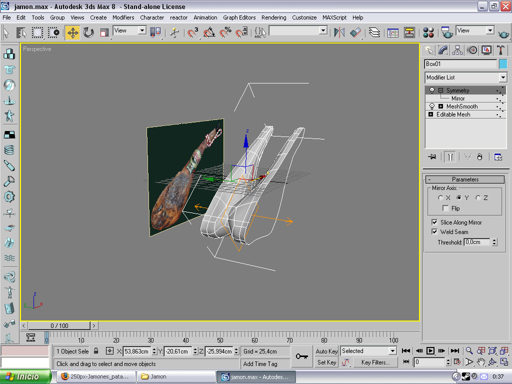 Hola. Estoy modelando un jamón (no me preguntéis porqué pues ni yo mismo lo sé, supongo que, porque es navidad y este año no he recibido ninguno) y al hacer la simetría me sale la otra parte del jamón justo al lado contrario.