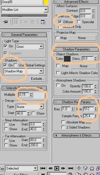 Después creamos una luz omni con multiplicador 0, 15 sin el Specular activado ya que no queremos que nos del brillo el modelo y el color no lo pongáis blanco, siempre un mínimo tono de gris ya que ensuciara más. El mapa de sombra los valores 512 que viene por defecto y 25 (por ejemplo). Luego si queréis le ponéis a un par de luces 0, 2 a otras le pones luz más gris, el caso es ir variando.