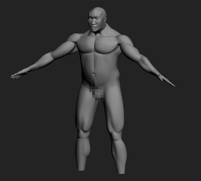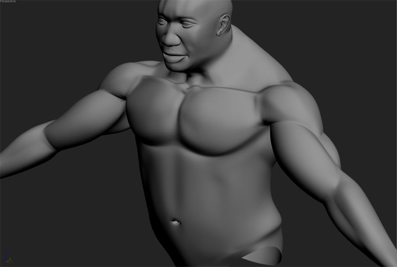 Buenas cwalls, ten en cuenta que lo que te digo es a mis ojos, a lo mejor el modelo es fiel a las referencias. Me parece que el cuello, los trapecios, están demasiado grandes, exagerados, a pesar de que es el modelo de un tipo musculoso. Le veo algo raro a la clavícula, está muy hundida la zona entre el hueso de la clavícula y los trapecios. Lo mismo sucede con las axilas, a lo mejor por el hecho de que tus referencias sean musculares. Por último, las piernas, las pantorrillas y los cuádriceps, las divisiones entre los músculos, no sé cómo decirte, están muy marcadas y creo que no es la conformación correcta para esos músculos.