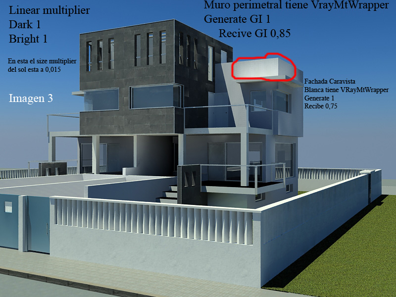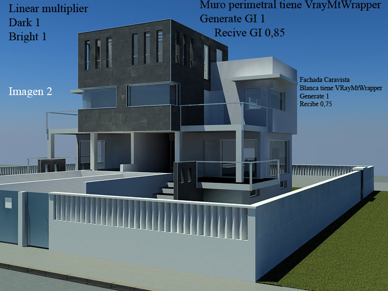 Hola Cebula, si dejo el segundo múltipler a 1 (ahora está a 0,5) me sangra mucho el color del césped sobre la pared del muro perimetral, si aumento la Vray Sky la escena se me vuelve muy azulada, con el Color Mapping en Hsv exponential he hecho varias pruebas que voy a poner para que las veas, el que mejor queda a mi parecer que es dark multiplier a 2 y el bright multipier a 1.