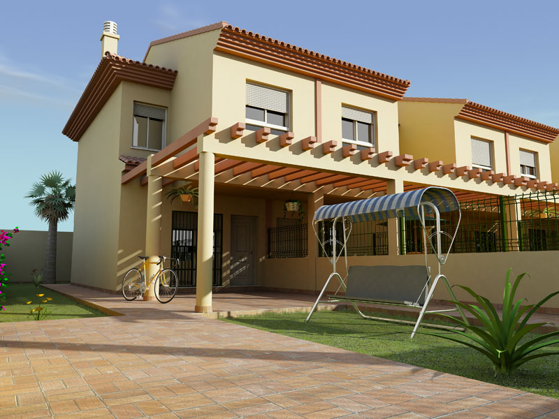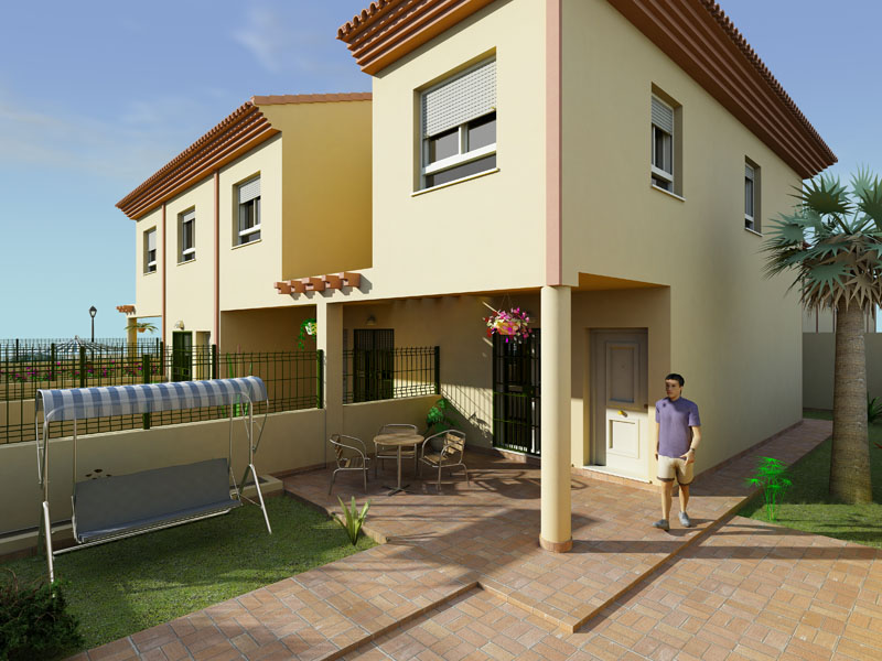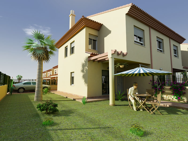 Las imágenes están bien. Quizá demasiado limpias yo le metería un poco de ruido. Los elementos vegetales son lo más flojo, sobre todo la planta que está encima de la puerta. En el césped se echa de menos algo de displace.