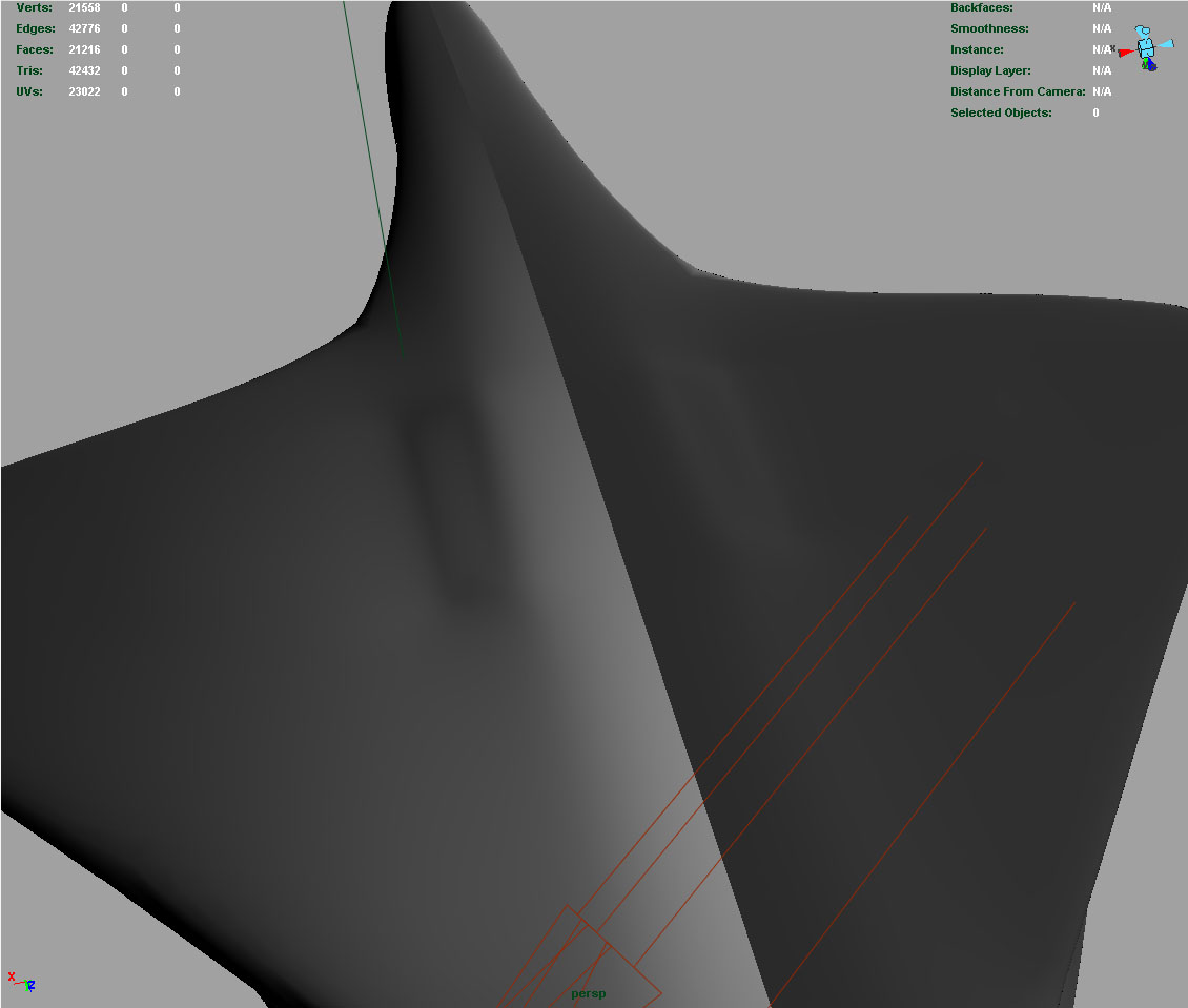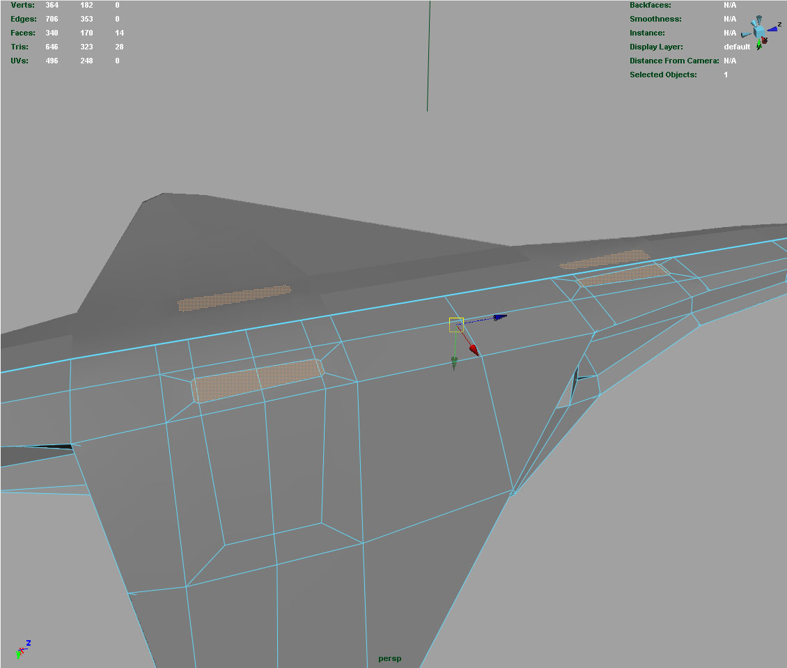 Tengo hecho el fuselaje que es bastante aerodinámico y he ido añadiendo aristas donde me hacía falta para darle la forma a las compuertas, pero a la hora de suavizar el modelo me hace algunas sombras raras alrededor de las compuertas (debido a que en esa zona hay más geometría que en el resto de la nave).