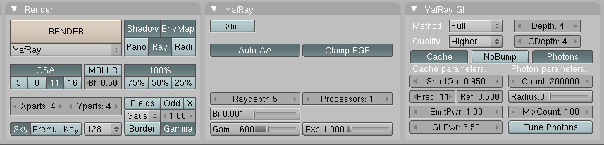 En un mensaje que vi sobre iluminación de interiores en el foro de Yafray, comentaban que para iluminar correctamente hacían falta por lo menos 5 luces. El tiempo de render que tienes en la primera imagen es bastante normal. No es por los parámetros de Yafray, es por la textura.