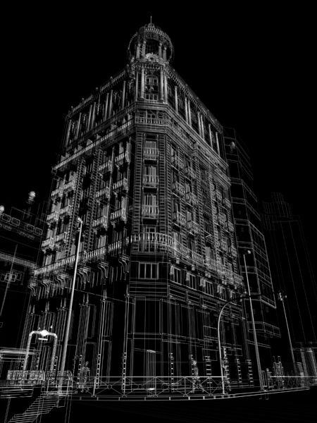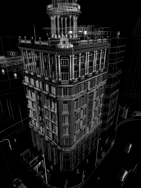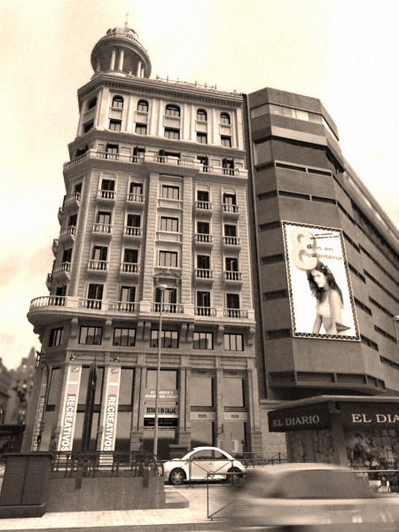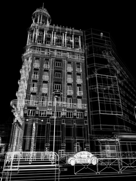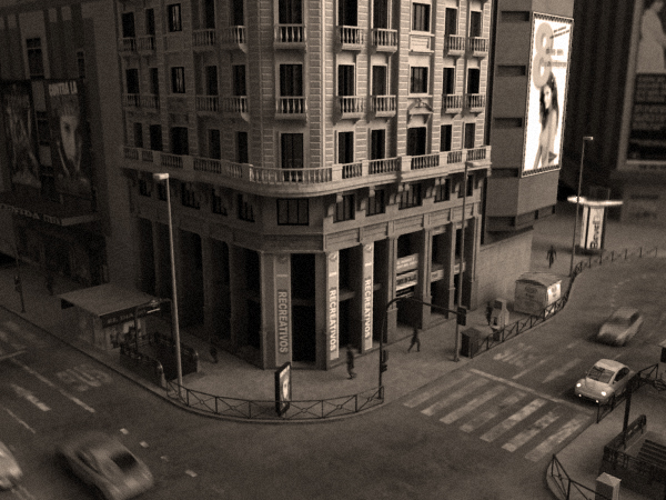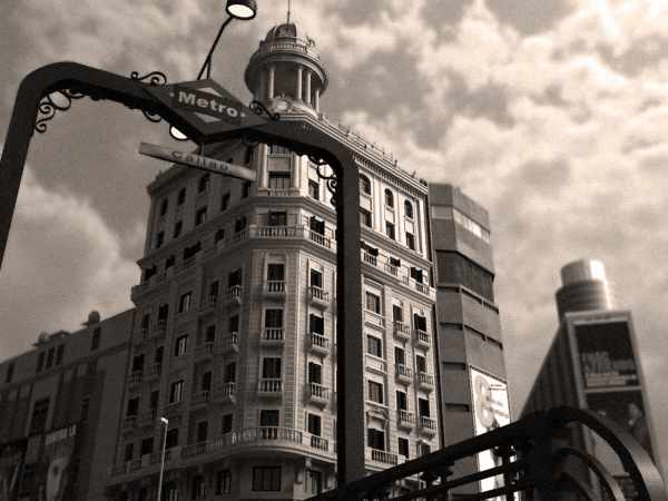 Vicio, vicio. Aunque luego ha tenido su utilidad para otros trabajos. Utilicé la guía del qdq (el callejero fotográfico) y algunas fotografías más de internet y mi memoria (ya que es una plaza por la que paso con frecuencia) para recrear este trozo de la plaza de callado. El resto, horas de curro con el 3ds Max, vicio (no se dónde escuche que el 3d puede ser adictivo), y luego un poco de Photoshop para hacer la imagen más artística.
