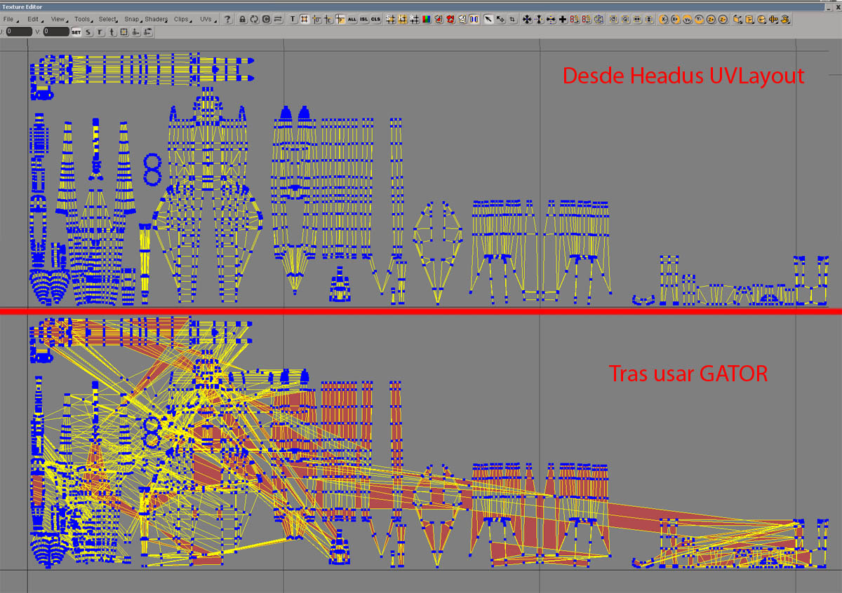 Bueno, para que veáis los problemas que he ido teniendo con el mapeado: Tras usar headus UV Layout y tras pasar las UV al modelo de XSI (eso que pone gator, para el que no lo sepa, es una aplicción de XSI para traspasar multitud de propiedades de un objeto a otro, solo que ha mi lo de pasar las uv`s me falla, cero que por la complicidad de la malla o que algo hago mal.