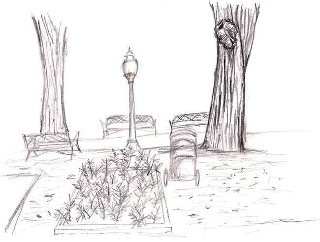 Al final os he hecho caso. Pasé por un parque y me paré en un banco a dibujar un poco. Esto es lo más decente que hice. Por lo demás intentaba dibujar a gente y roza lo imposible de forma detallada. Dibujar gente andando es fácil y aburrido, si busco gente en posiciones originales en seguida se mueven y es imposible. Qué malos modelos son. Sólo me salían garabatos, pero algo es algo. Gracias Herbie por tus consejos, me estas cayendo bien y todo. La tableta me costó 40 euros pero ya ves tu lo que me ha durado. Además, estoy seguro que una Wacom (300 euros pues fíjate) no será ni comparación el tacto y demás, porque la que yo tengo sabe a plástico puro y duro. Saludos.