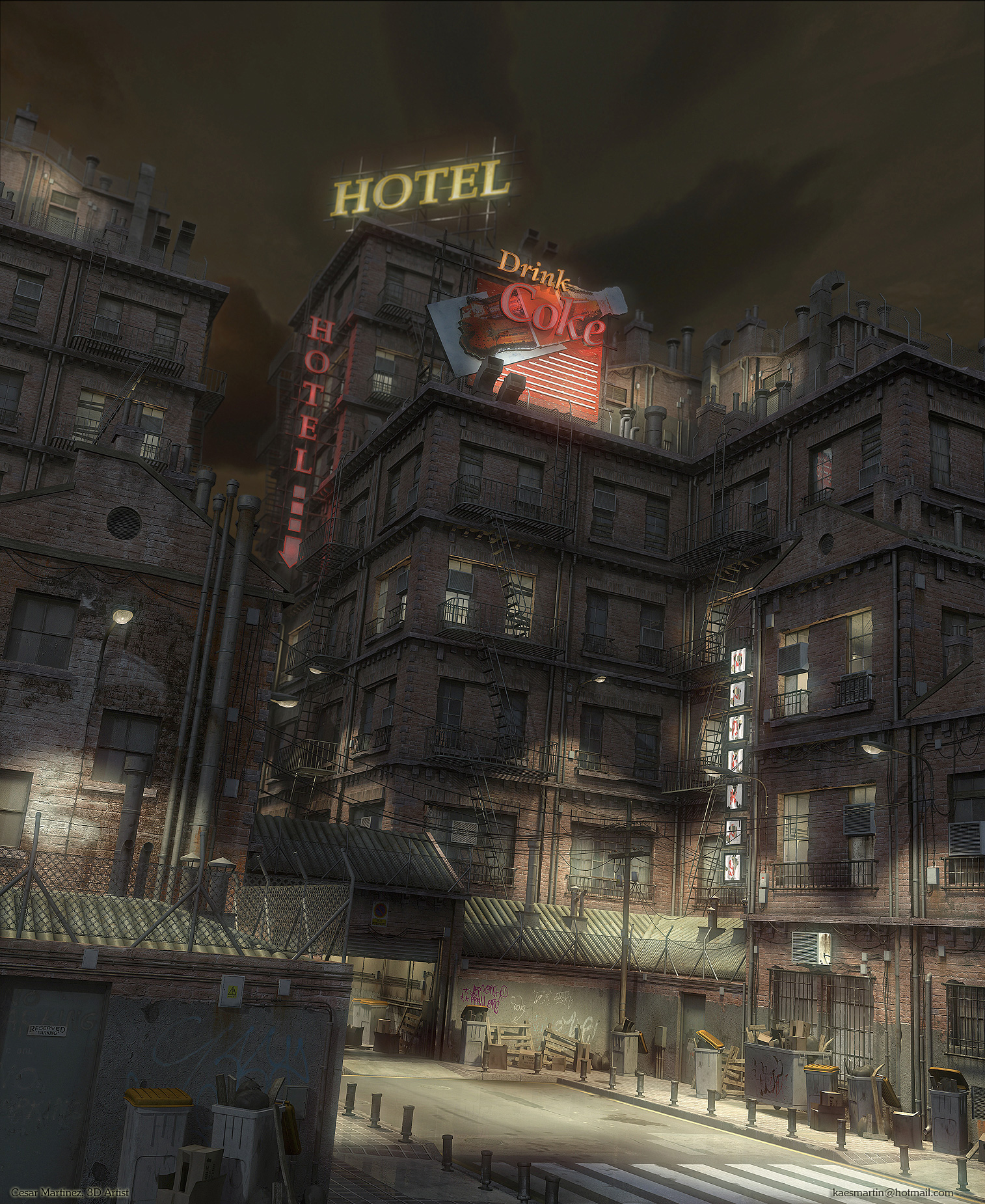 Muy buenas a todos, esta es al última imagen en la que he estado trabajando estos últimos meses. Como siempre todo está modelado en 3dsmax, la iluminación con múltiples luces, un domo para simular una Skyline y spots para los puntos de luz principales, para el render use Scanline. Toda la postproducción de la imagen está hecha con Adobe Photoshop y Combustion.