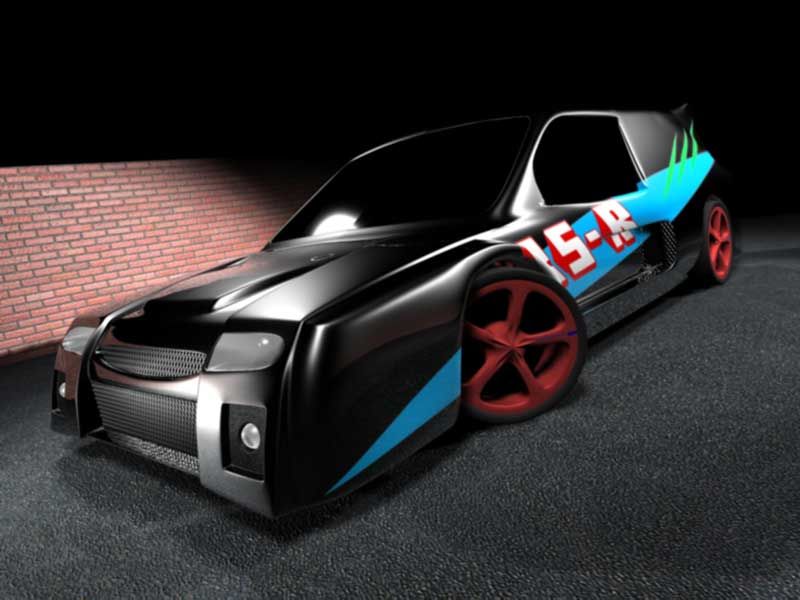 El coche. Para ser invento tuyo está muy bien, yo le agregaría un par de detalles como espejos retrovisores, algún logotipo, etc. Como para darle un poco más de realidad. Saludos.