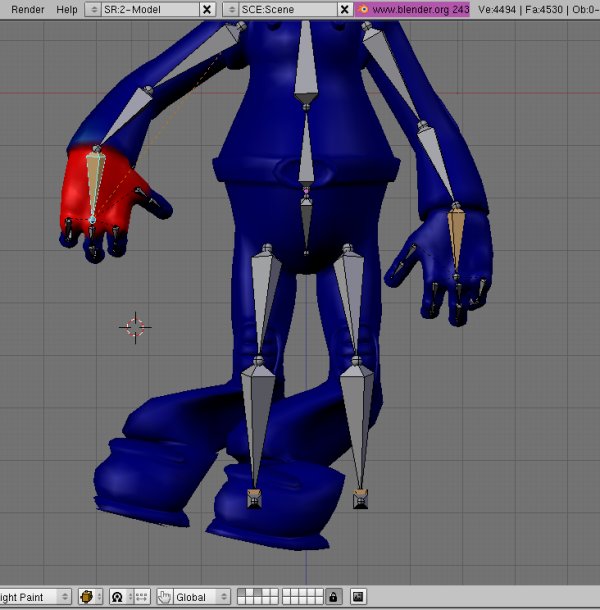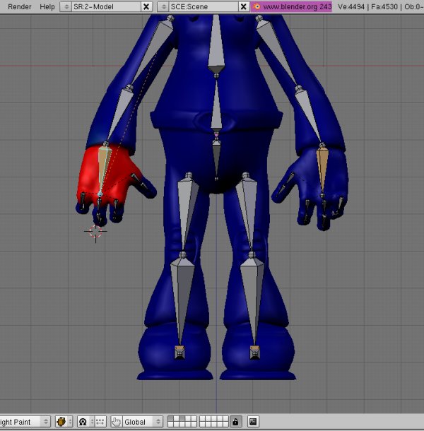 Buenas. A ver si podéis echarme una manilla. Tengo un personaje con un esqueleto básico y todos los vértices asignados a su correspondiente vertexgroup de cada hueso. Ahora bien, todos los huesos funcionan perfectamente con sus vértices, excepto los de la mano derecha. Cuando muevo ese hueso, se me mueven también los vértices de las piernas, a pesar de que nunca han estado asignados a ese vertexgroup. Estoy harto ya de selecionarlos y desasignarlos de ese grupo, pero como si nada.