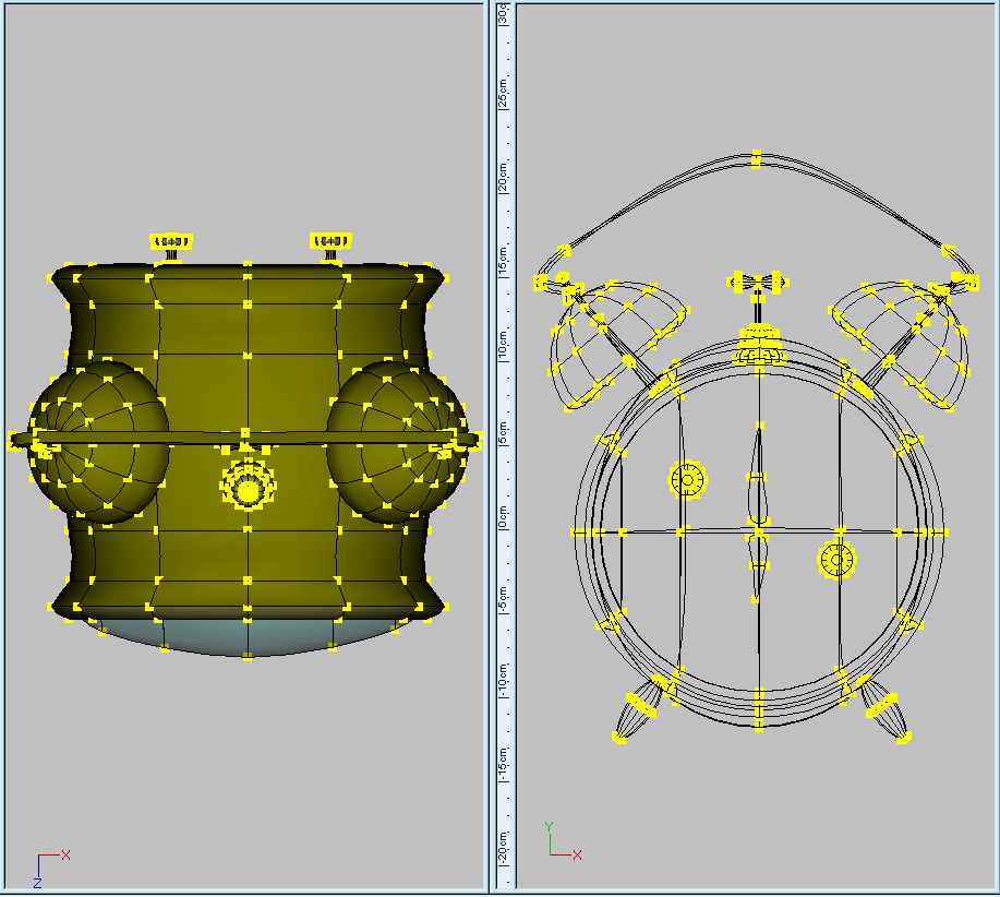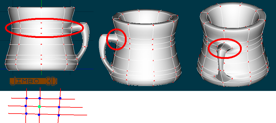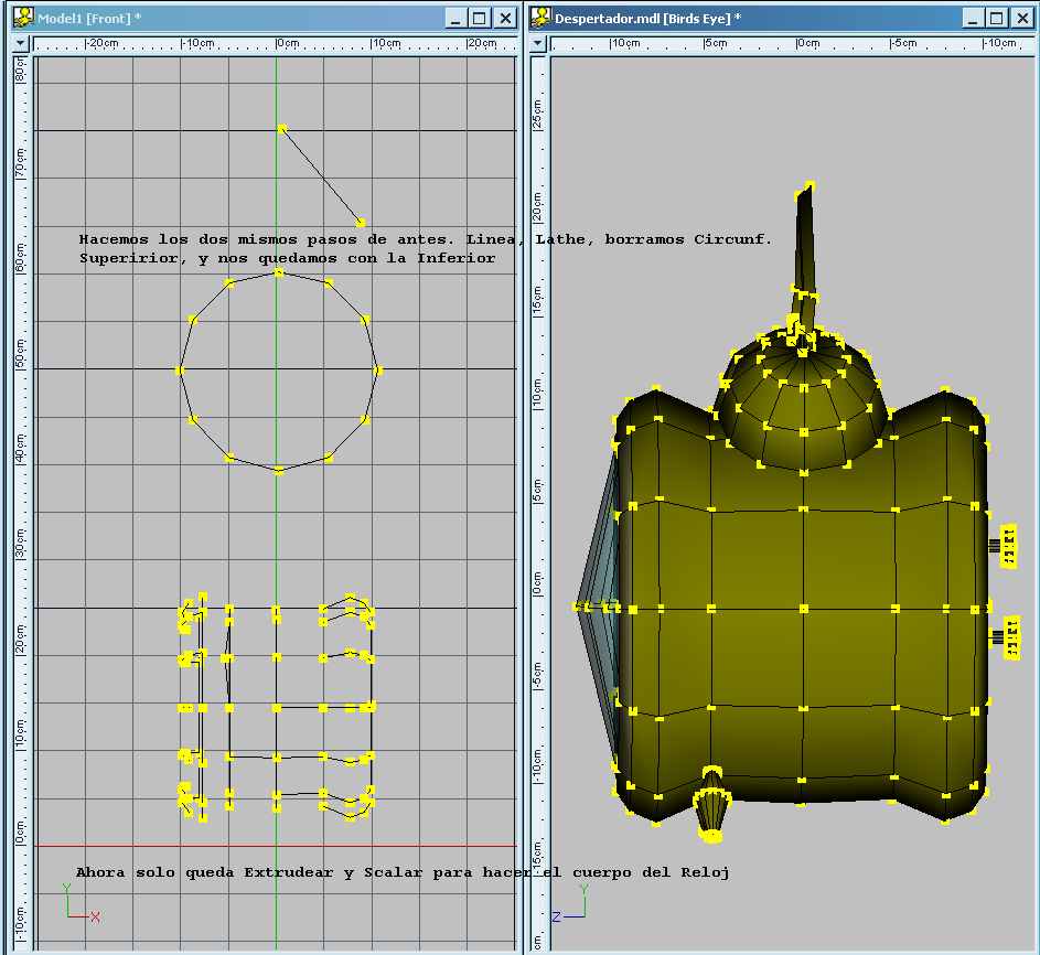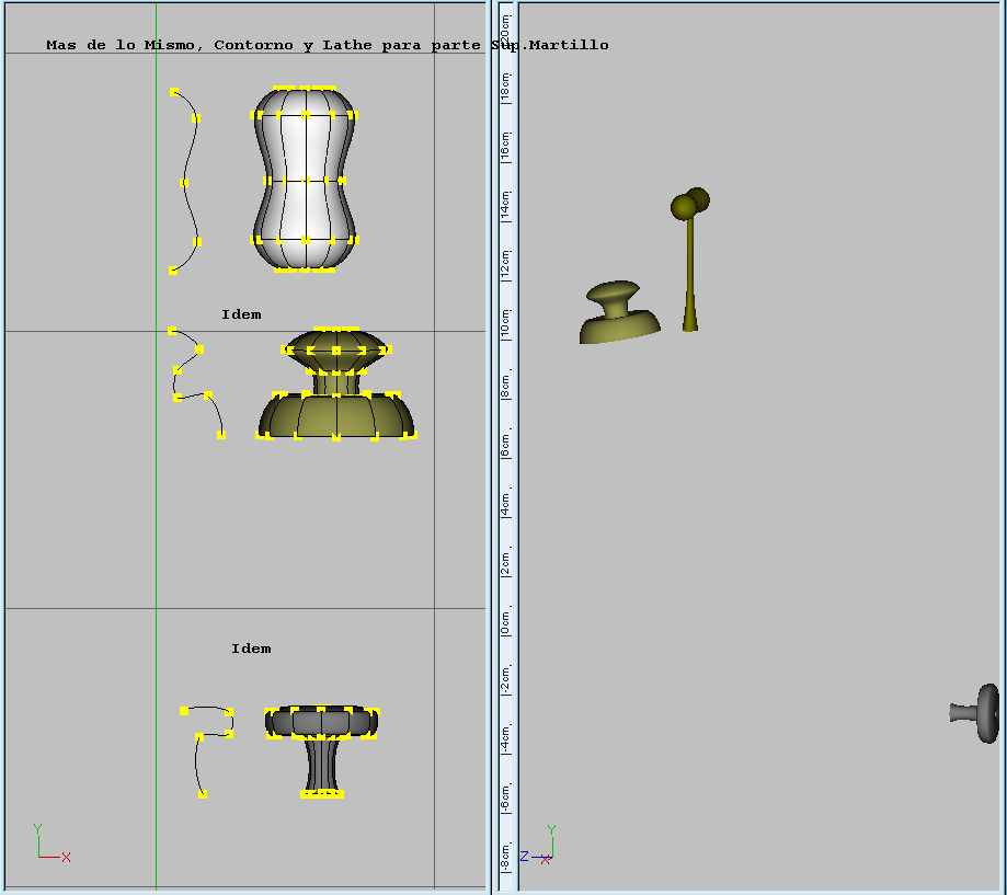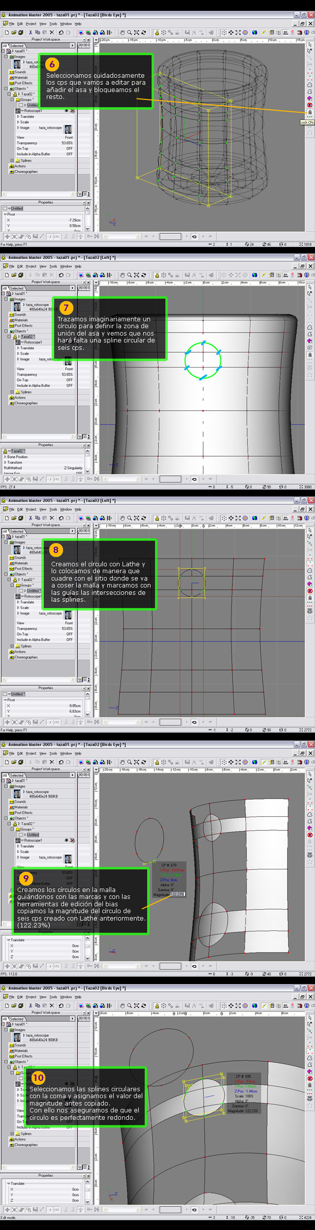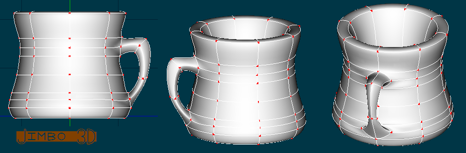 Luego, en base al resultado utizar lathe, distorsión mode y extrude mode dónde convenga. Para el asa simplemente dibujé el contorno. Luego extruí para dar grosor y luego para hacer los biselados. Al ser un objeto simétrico, visto de frente, claro, modelé la mitad para luego aplicar un copy/flip/attach y para terminar cos? Los agujeros que quedaban.