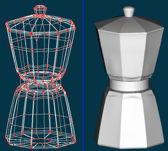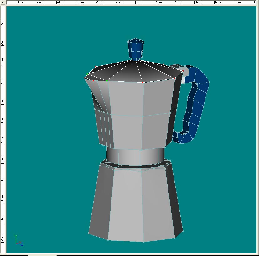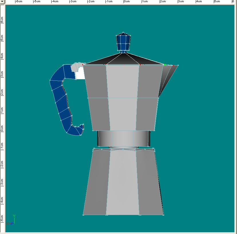 La el vaso de la cafetera, por llamarlo de alguna forma, es una especie de octagono, para mantener el biselado y una malla poco densa creé un círculo con lathe de 16 puntos. Con extrusiones y escalados se logra la forma y se editan las bias para que los biselados queden correctamente dispuestos. Luego utilicé el distorsión mode y un par de retoques al final.