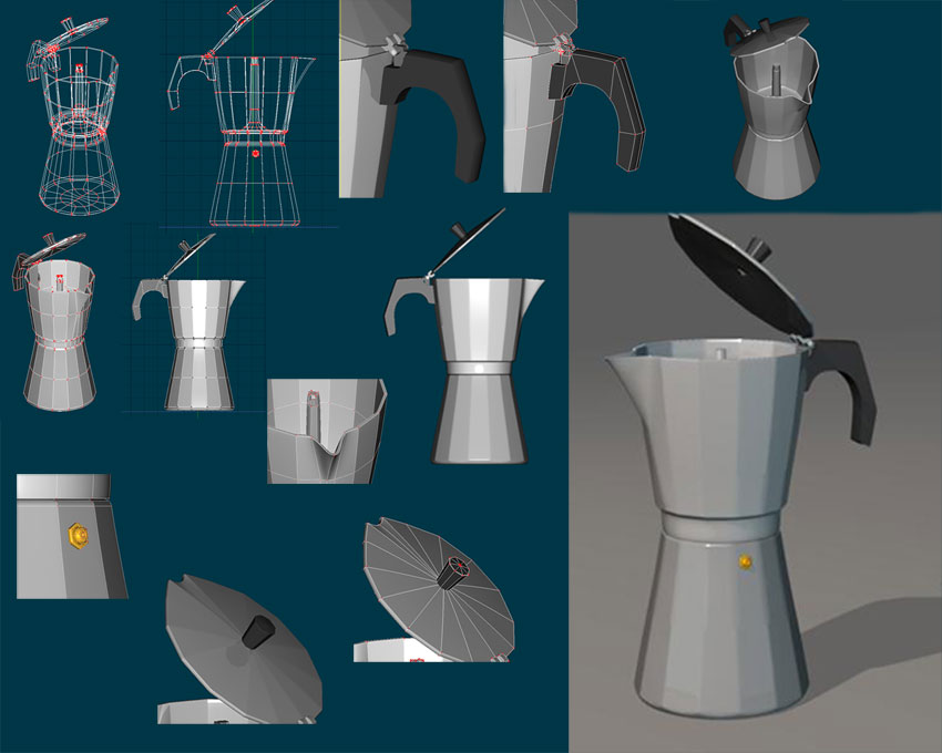 Los objetos mecánicos no tienen por qué ser una sola malla, de hecho, si los hiciéramos así sería muy problemático hacer el rigging. Yo hice todas las piezas separadas, de manera que, se pueda animar la tapa y desmontar el vaso de la parte inferior donde se deposita el agua. Si tengo un tiempo hago una sencilla animación de demostración, aunque son temas para ejercicios futuros, para saciar la curiosidad.