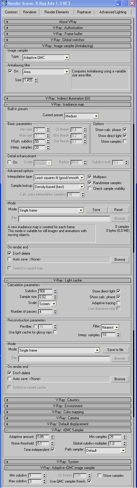 Esta de más decir que también pobré diferentes valores básicos para el Irradiance Map, todos los presets (aparte de un custom de min. -3 y max -1) lo único que me hacían era aumentar el tiempo de renderr, pero mantenerme el ruido, lo que el aumento de calidad era casi imperceptible.