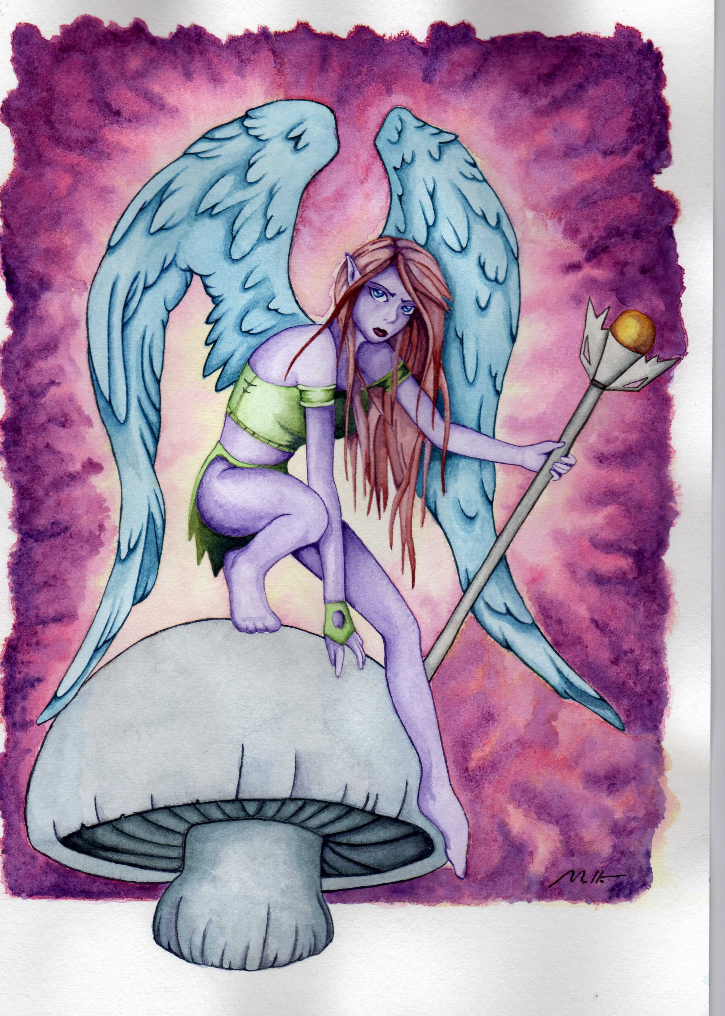 fallos de anatomía tiene, pero se nota que te has esforzado y los ojos, la expresión de la cara, y el color en general están muy bonitos. El fondo, para mí gusto particular, sobra, porque le quita mucho protagonismo a la figura, llama demasiado la atención. Al pelo le daría un poco más de vida, cae demasiado lacio y sin brillo. El cetro, si es metálico, debería tener algún brillo fuerte, y lo mismo la luz amarilla. Un buen golpe de pincel amarillo o blanco muy brillante a la esfera del cetro quizá le daría más vida. Ánimo y sigue los consejos que te han dado. Ya verás cómo mejoras un montón.