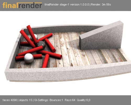 En el plano que hacía de suelo, justo en la base de la tetera, antes se mostraba oscurecido como si de una sombra se tratase. Al levantarla, el motor de render no recalcula está iluminación porque ya estaba calculada, de modo que aún la muestra oscurecida, cuando debería entrar luz a ella. Final render ha creado un nuevo engine para solucionar esto. Se trata de Hyper GI. Como cualquier render con GI, este trata de simular la realidad. Pero una simulación no es la realidad en sí. HyperGI es válido para aumentar la sensación de realidad respecto a una animación, pero cada uno de sus fotogramas, que deben ser calculados en tiempo récord, no pueden semejarse a los calculados por otros sistemas.