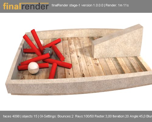 El video está iluminado por un spot muy suave para generar sombras, y skylight de FinalRender con un mapa HDRI para iluminar la escena. Las bolas tienen reflejos. La tonalidad de toda la escena ha variado al activar HyperGI. No sé el motivo exacto, y si se puede mejorar. Habrá que trastear con él.