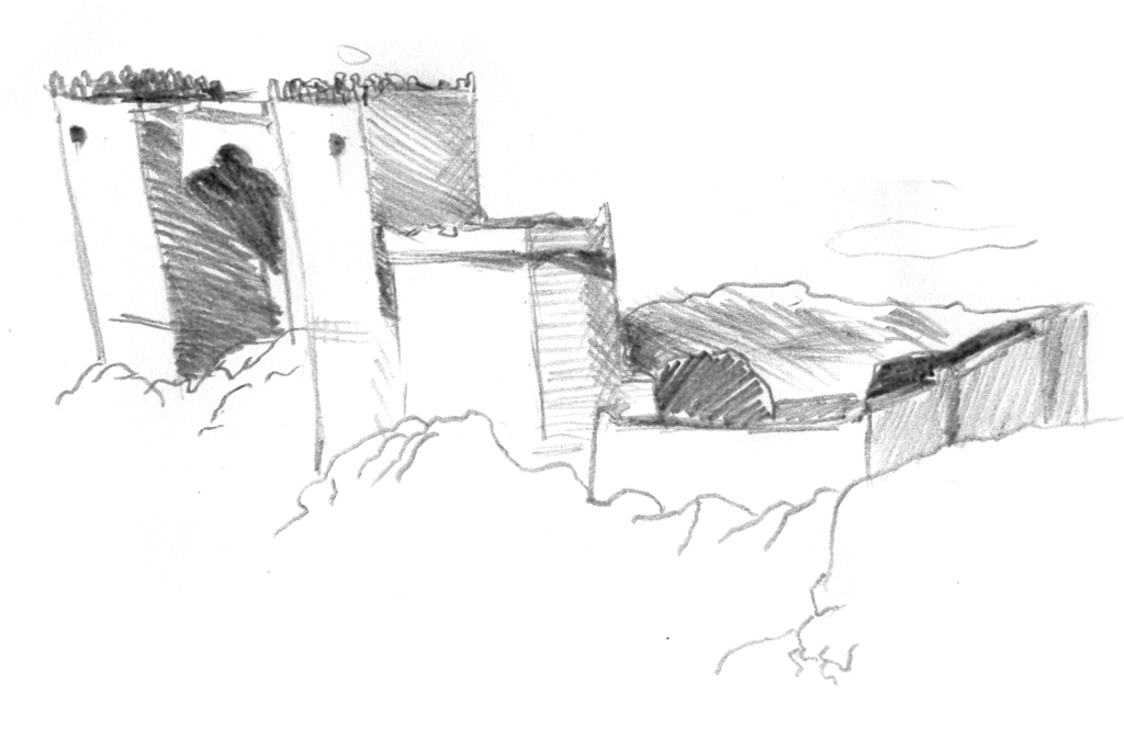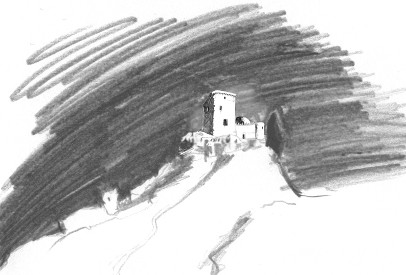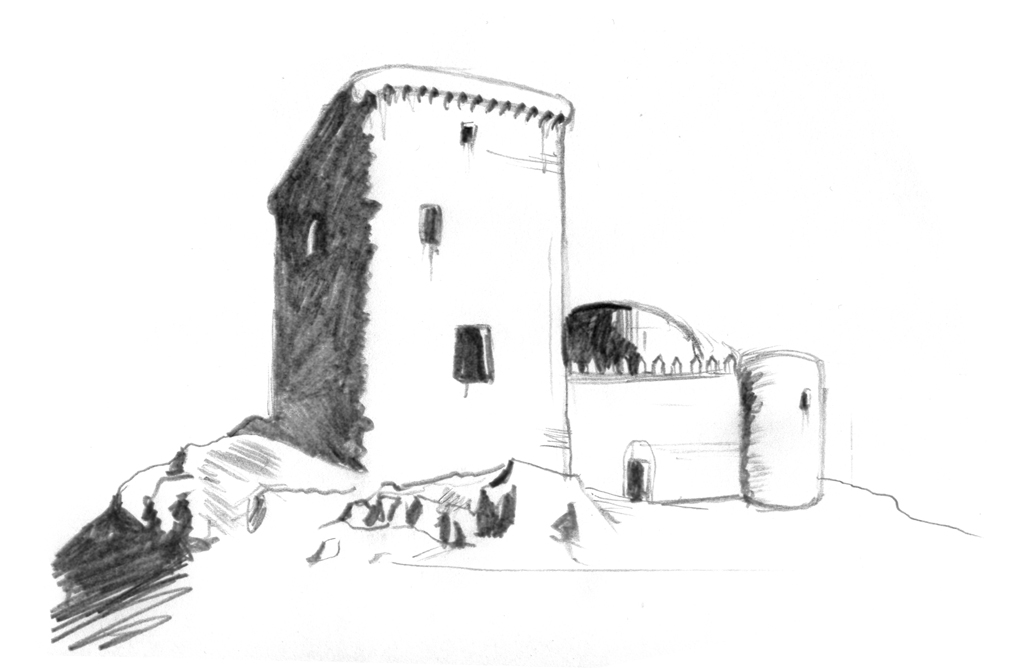 Ayer leyendo un artículo cultural en el periódico leí sobre la torre ensangrentada de Badajoz y me vino la inspiración. Me doy cuenta que mis dibujos se limitan casi exclusivamente a los personajes que conforman la escena. El fondo lo dejo en un segundísimo plano. Hice un par de bocetos y apunté algún dato sobre esta torre de los templarios decapitados, el tema tiene mucha chicha. Así que al levantarme hoy de mañana fue lo primero que se me vino a la cabeza y me dió por retomarlos y, por una vez, darle protagonismo en una obra mía a un monumento tan interesante. No voy a hacer un dibujo de la realidad, más bien es lo que me inspira todo lo que leí ayer con mi copa de licor café en mano. Primeros bocetos.