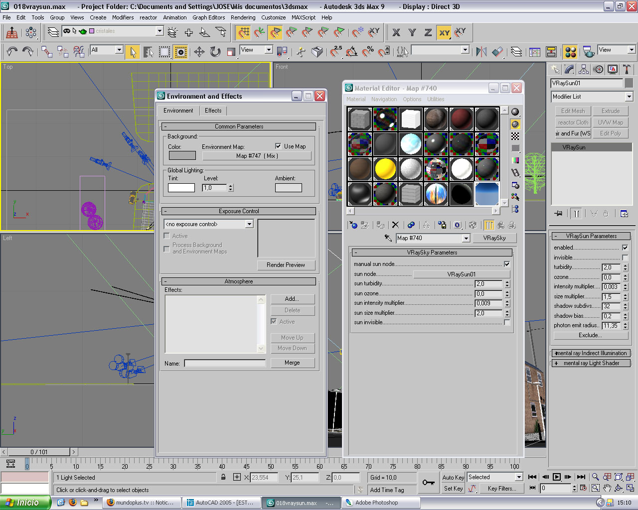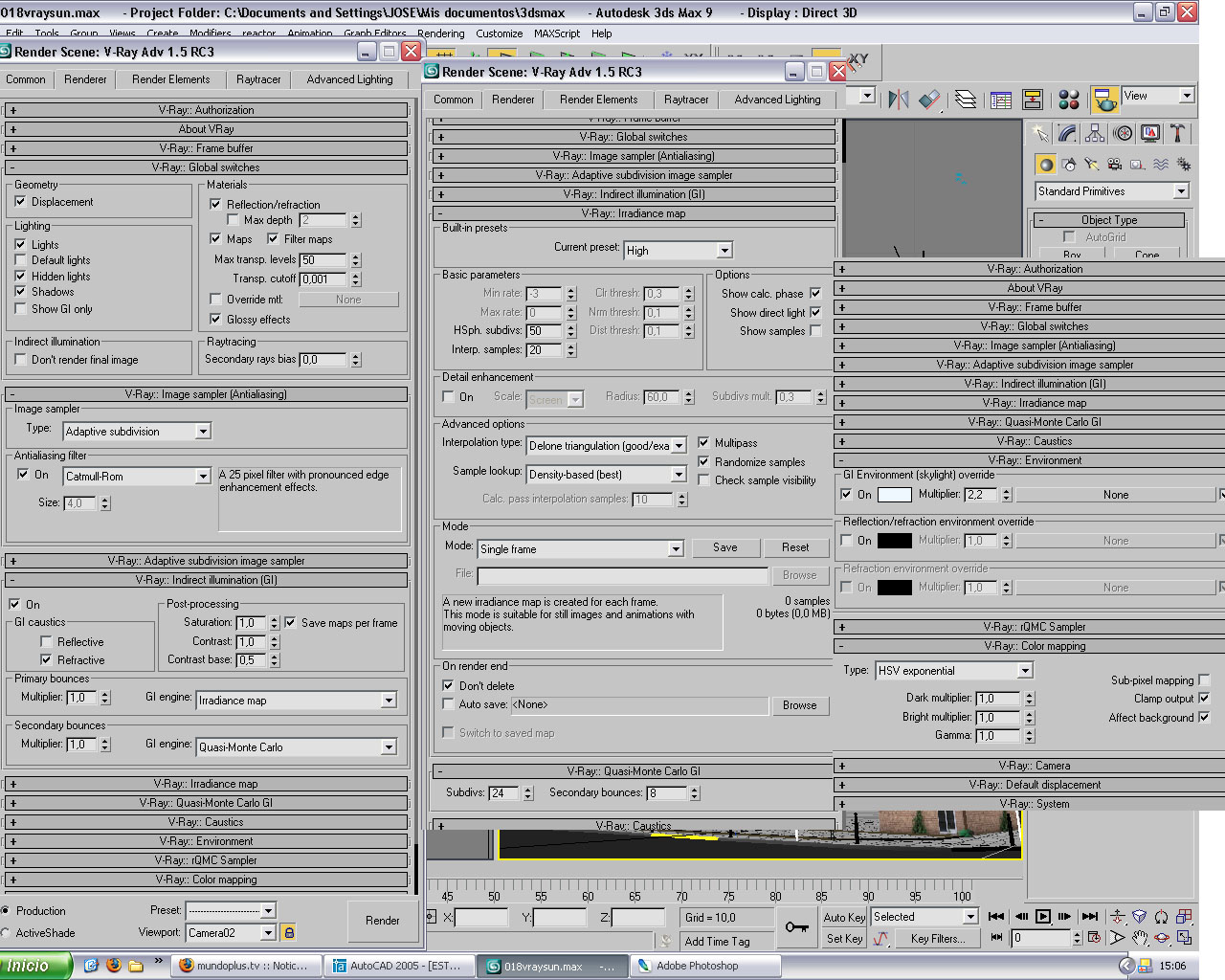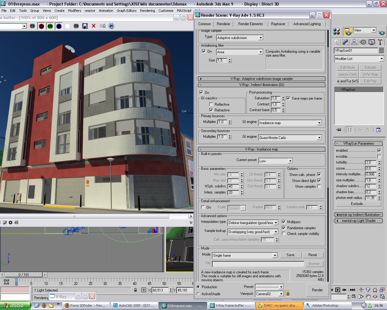 Estoy con este edificio, y estoy haciendo pruebas con el Vray Sky y Vray Sun, pero no consigo una buena iluminación, os pongo unas capturas de cómo va el trabajo así de la iluminación que estoy utilizando y del motor de render a ver si me podéis echar una mano para que me quede mejor. Gracias a todos.