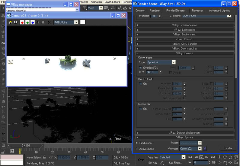 Y finalmente debemos configurar la cámara en los parámetros de Vray como muestro en la imagen, en tipo cambiamos a Spherical y activamos Fov y ponemos un valor de 360, con esto deberíamos tener suficiente para tener un render panorámico como también se muestra en la imagen: