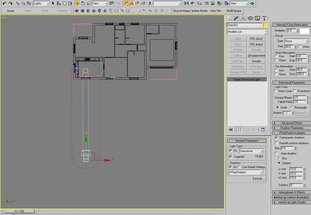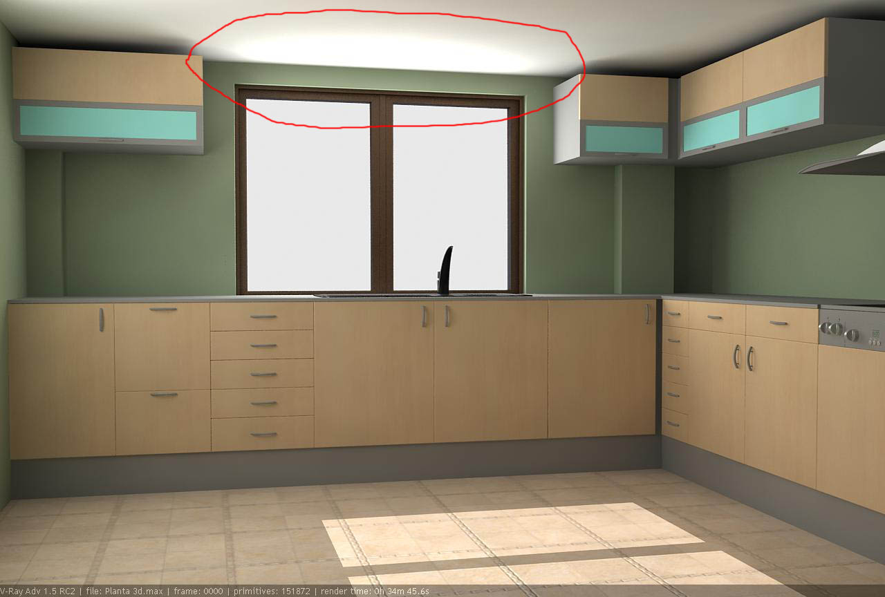 Bueno, no sé si se vería mejor que la luz entrara diagonal por las dos ventanas (es decir que el punto de luz se situe hacia la esquina del plano), ¿cómo puedo darme cuenta y tal cómo está puesta se da para confusiones de proyección de las sombras. Me parece (no soy muy experto en el tema) que la proyección de luces o radiosidad no se calcula de forma óptima ya que si das cuenta sobre la ventana se refleja un claro intenso que solo se daría si la luz entrara directamente por dicha ventana y me parece que los rincones opuestos a la luz deberían ser un poco más oscuros, sería bueno que simularas una radiosidad con varias luces (esto da mucho trabajo, pero suele tener resultados muy buenos). Saludos.