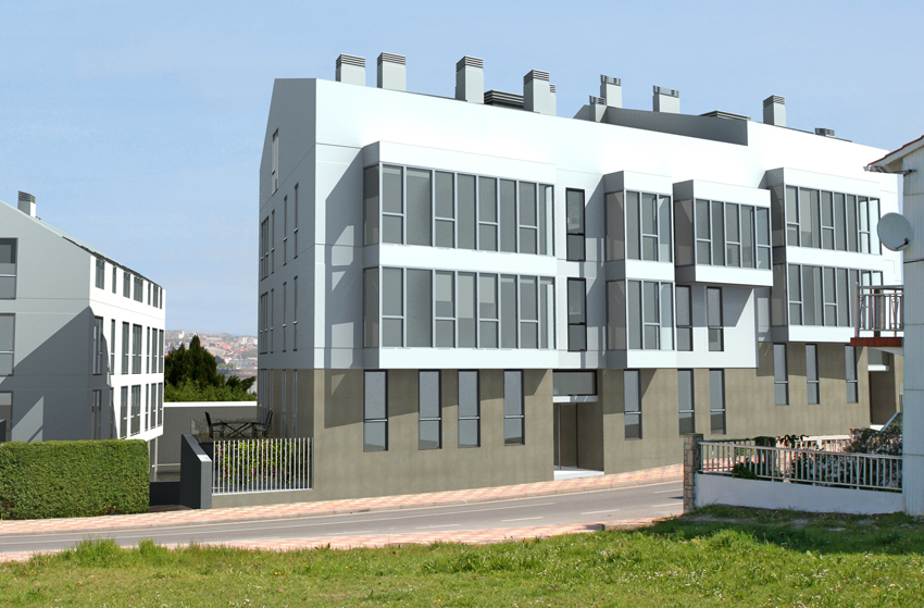 El muro blanco es monocapa? Le daría alguna textura. El vidrio de los miradores no me convence. También trataría de ver otro punto de vista, aunque supongo que, has tenido que ajustarlo a la fotografía para hacer el fotomontaje.