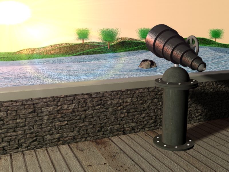 Yo creo que le podrías sacar muchísimo más partido a la escena, tal vez con otro escenario más nocturno. En cuanto a la escena, o tal cual está, el agua no me convence, las montañas no me convencen, los árboles no me convencen y la base del catalejo parece estar flotando en el aire.