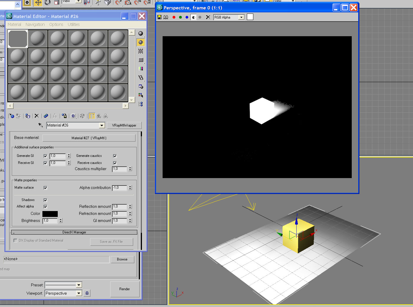 Hola a todos/as. Tengo una duda que no sé cómo resolver. Estoy renderizando con Vray bajo 3dsMax 8. Quiero renderizar una serie de objetos desde la vista top de manera que, proyecten una sombra estándar sobre el suelo. La duda es que necesito esos objetos y esa sombra, pero sin el suelo. Vamos que querría poder poner ese objeto y esa sombra sobre otra imagen cualquiera.
