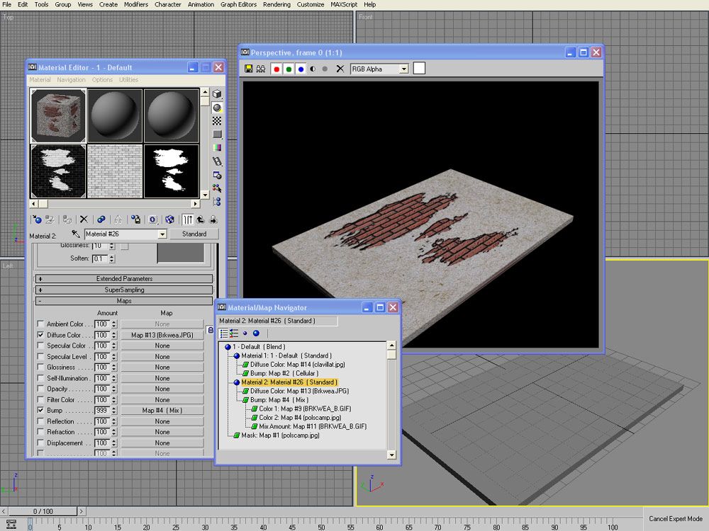 Hola de nuevo. Cómo has utilizado un material (*.mat) mezcla, para que el mortero tuviese relieve sólo tendrás que aplicarle el mismo bitmap que utilizaste como máscara del material mezcla.