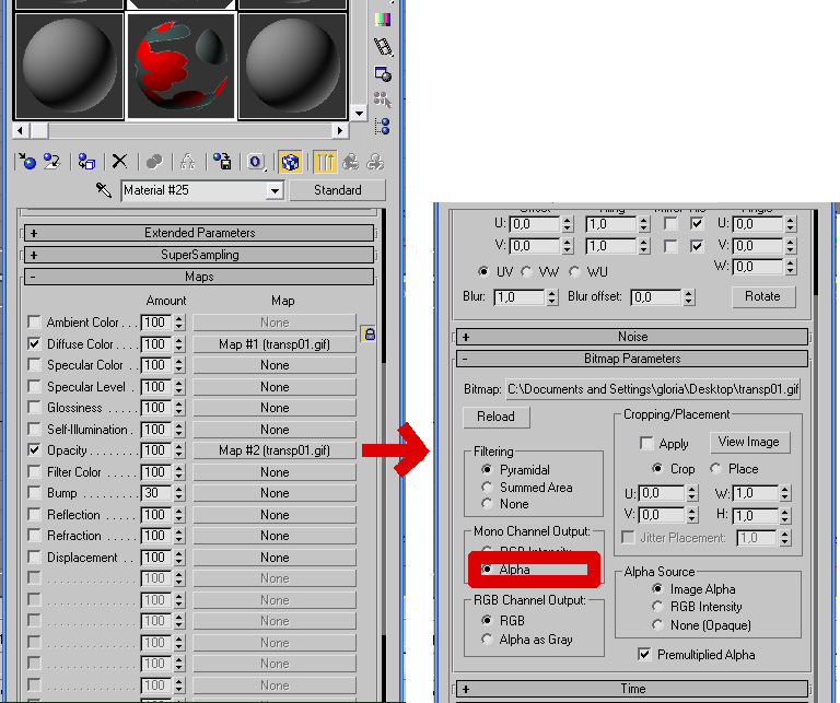 Hola, estoy intentando hacer que un objeto sea transparente en ciertas zonas de un polígono aplicándole una textura con canal alfa (he probado con (*.png), (*.tga) a 32bpp, y tif). En Photoshop se ve el ajedrezado de fondo, así que, no hay duda de que la imagen postura transparencia. Activo alpha en el mono channel de los parámetros del bitmap del editor de materiales de 3ds Max.