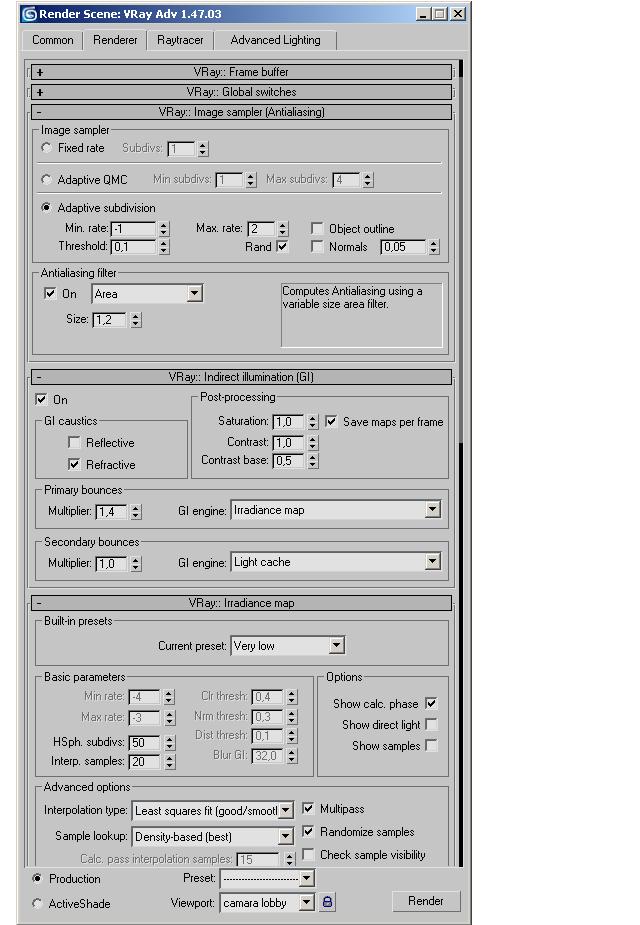Hola a todos, la imagen que estoy publicando, la estoy iluminando con Irradiance Map y Light Caché y siempre me sale el muro manchado, así le suba a la iluminación. Las subdivisiones del Light Caché no son, porque ya les subí y sigue manchándose, alguna vez arregle el problema de las superficie granular, pero si alguien me puede ayudar a mejorarla para que no me salga manchada y poder bajarle a la iluminación para que no se queme, lo agradecería bastante, gracias.