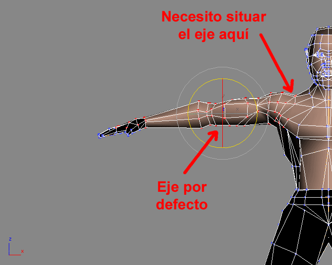Estoy realizando un personaje Low-poly con edit Mesh. He seleccionado los vértices del brazo y necesito rotar estos. Pero antes debo colocar el punto pivote (eje) en la parte que indica la imagen cómo lo hago.
