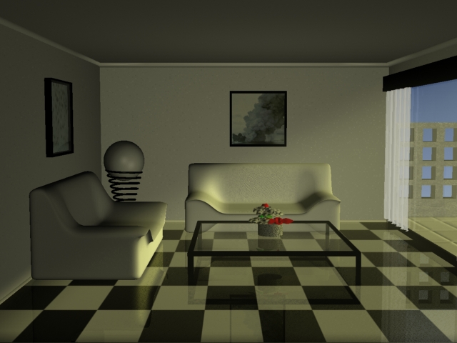 Hola a todos de nuevo. Otro render del salón. Poquito a poco va mejorando. Sigo estudiando lo de la iluminación, que no gusta nada, y pregunto:¿por qué se refleja la maceta en la cristalera si lo que hay es una cortina? Agradezco vuestros comentarios.
