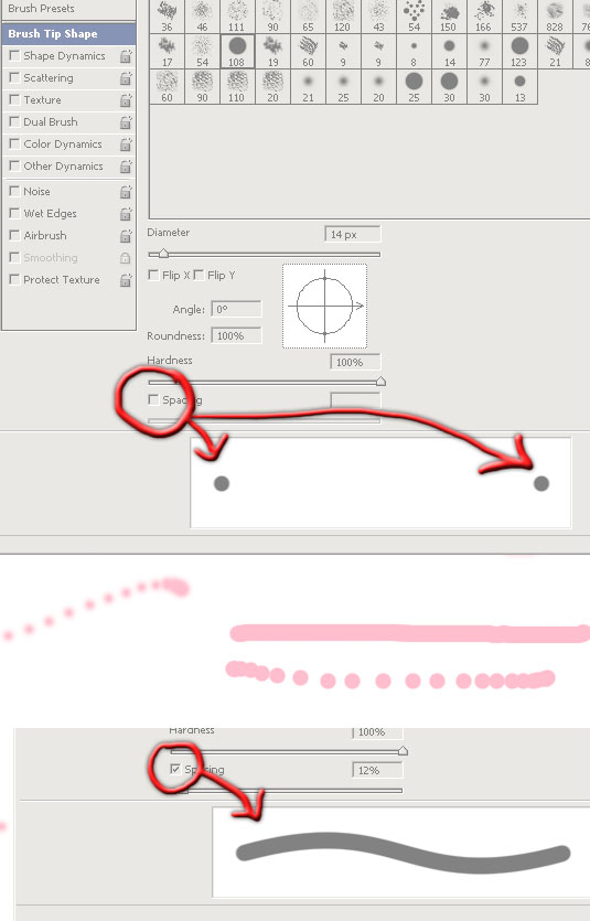 A ver se trata de la herramienta pincel de Photoshop, al pintar sobre una imagen de 1000 por 1000 px a una resolución de 300px/pulgada, es decir una imagen que se considera grande relativamente pues cojo un pincel de un diámetro de 14 px, más claramente, la herramienta pincel con un radio pequeño sobre una imagen grande,al dibujar el pincel se me divide es decir se ven esferas, y no sale un trazo continuo no sé si me explico, creo que se trata de alguna hotkey desactivada ya que no hay ninguna opción a la vista, que lo especifique claramente. Saludos y gracias.