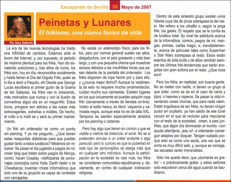 Edito2: y voy a decir más, denomina friki a gente que está todo el día frente a un ordenador. Ella no, ha escrito el reportaje en 3 semanas escribiendo de tecla en tecla, mientras le daba placeres a dos o tres cincuentones de su redacción. Y luego dice lo de las camisetas negras y todo ese . Cuando en la feria de abril y en la feria taurina, se presentan trajes, que eso sí que son frikis. Trajes de lunares en el siglo XXI y para los toreros ropas ajustadas, con los pantalones por la rodillas y luego una chaqueta que pesa un huevo.