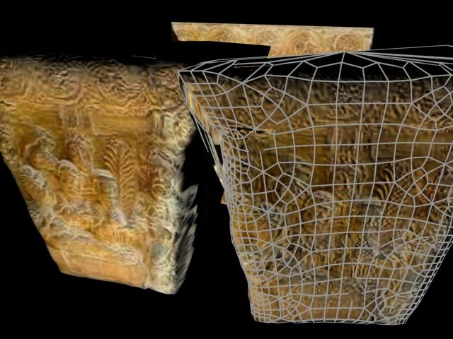 Luego hago una triangulación de los cuadrados que vea que quedan demasiado grandes y que necesitar hundir o sacar el vértice para darle el efecto 3d y una vez hecho esto, voy seleccionando los conjuntos de vértices que forman parte de un mismo plano (en la imagen puedes ver en primer plano a dos tíos y la mesa, en un segundo plano a otros dos y al fondo uno más y una hoja chunga) y los voy sacando (sin pasarme, pero sin quedarme corto) un poco hacia afuera, dejando los vértices de los bordes sin seleccionar y ajustando algún vértice que en mi opinión debería destacar más (como en el torso de los cuerpos y las caras) y hundiendo otros (como los cuadrados esos de la parte superior del capitel).
