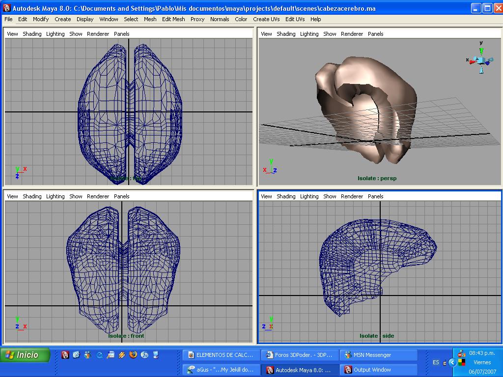 Estoy usando el Maya 8.0. Estoy tratando de crear un cerebro, y tengo la forma principal, las vetas las voy a hacer con un Bump, pero dejé un hueco enorme debajo de la figura (adjunto la fotografía), además mis técnicas de modelado no son demasiado buenas, y la Maya en si está echa un desastre, probé con bridge, pero no me funciona, Fill Hole funciona, pero tengo que cortar lo que queda en mil pedazos, y me parece que sería más fácil empezar todo de nuevo antes que hacer eso. Mi pregunta es. ¿hay alguna forma fácil de llenar ese hueco, o debería empezar todo de cero? Y si tengo que empezar todo de cero, ¿hay alguna manera de usar el modelo actual como molde para el nuevo objeto, y así ahorrarme algo de trabajo?