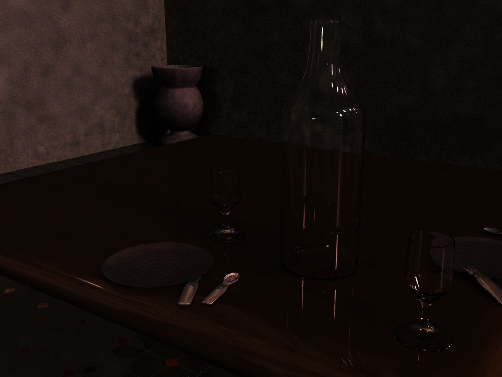 Bueno, recién salido del horno, desp de un par de tutoriales y varios render de prueba este es mi primer render en Blender (primer render no prueba, el sexto en realidad), en realidad esta renderizado con Yafray, y los modelos de las copas, platos, cubiertos, la botella y el jarrón están hechos con Wings 3d.