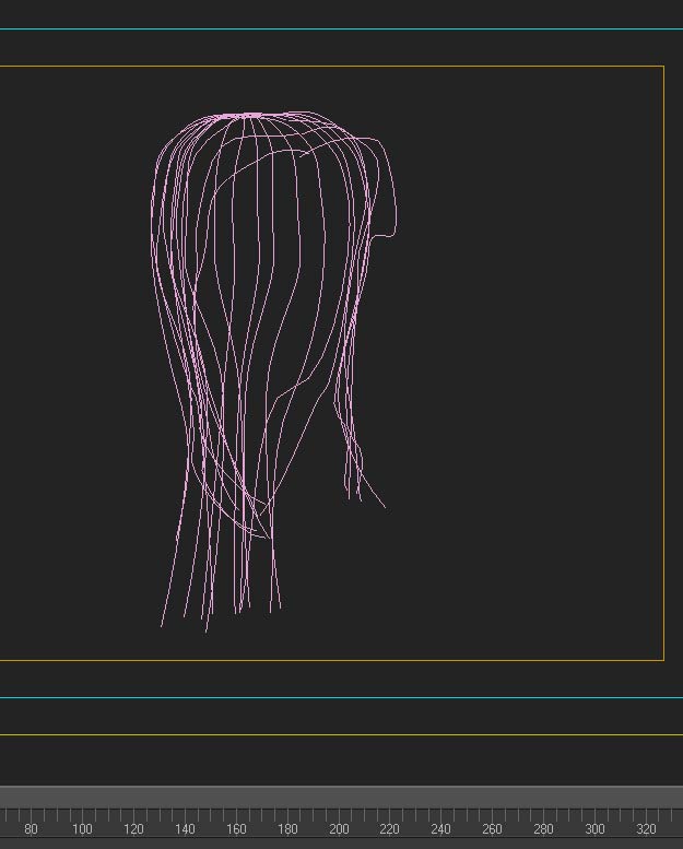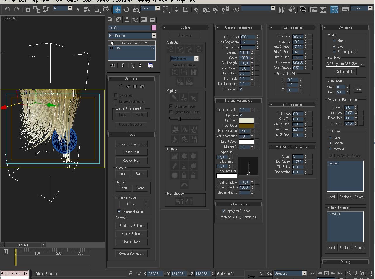 Adjunto unas imágenes del pelo, de los Splines y de los parámetros (en esta también aparece cómo se cuela dentro de la esfera de colisión).