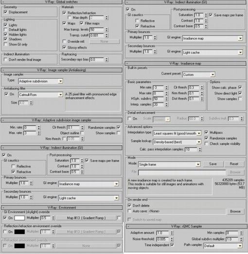 10/16 subdivisiones usando vraylanczosfilter, esto contrarestará un poco el tiempo de render al bajar en randomized Quasi Monte Carlo y ganara en nitidez.